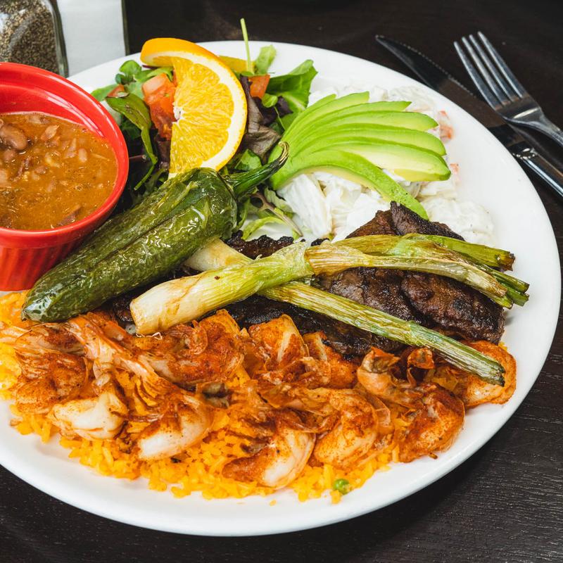 Skirt Steak and grilled shrimp. Served with rice, salad, potato salad and charro beans. Served with homemade tortillas.